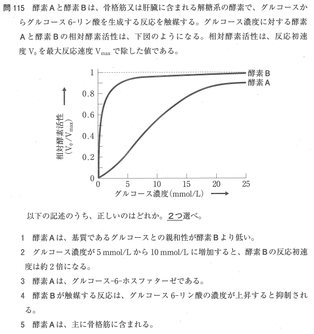 1:○ グラフより、酵素A(グルコキナーゼ)は酵素B(ヘキソキナーゼ)よりも基質親和性が低い(Km値が高い)ことがわかります。