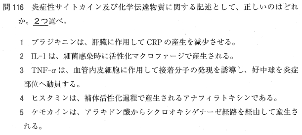 5:× ケモカインはタンパク質(サイトカイン)の一種です。アラキドン酸から生じるのはプロスタグランジンなどです。