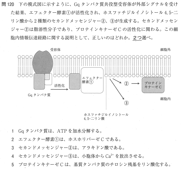 4:○ セカンドメッセンジャー③は「イノシトール 1,4,5-三リン酸(IP3)」であり、小胞体にある受容体に結合して貯蔵されているカルシウムイオン(Ca2+)を細胞質へ放出させます。
