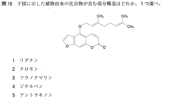 解説:この化合物は、グレープフルーツなどの柑橘類に含まれるベルガモッティン (Bergamottin) です。 三環性の骨格部分は、クマリン環にフラン環が縮合した「フラノクマリン」構造をしています。