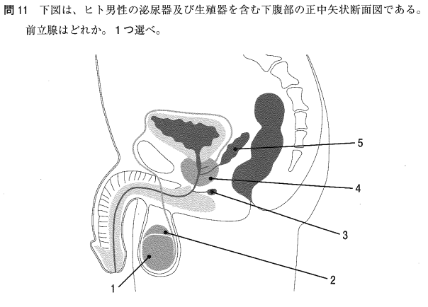 解説: ヒト男性の泌尿器及び生殖器の図において、膀胱の真下に位置し、尿道を取り囲んでいる器官が前立腺(4番)です 。ちなみに1は精巣、2は精巣上体、3は尿道球腺(カウパー腺)、5は精のうを示しています 。