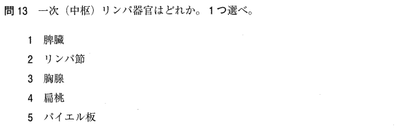 解説: 一次(中枢)リンパ器官は、リンパ球が産生され、抗原特異的な受容体を獲得して分化・成熟する器官であり、「骨髄」と「胸腺」が該当します 。脾臓、リンパ節、扁桃、バイエル板などは、成熟したリンパ球が抗原と出会い免疫応答を起こす二次(末梢)リンパ器官です 。
