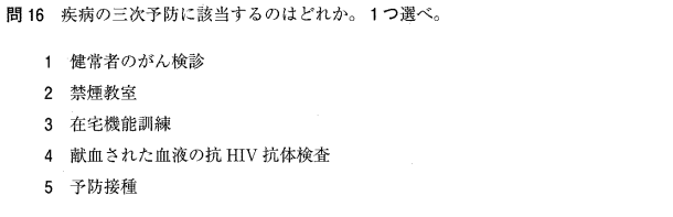 - 二次予防(早期発見・早期治療): 健常者のがん検診 、抗HIV抗体検査 など。