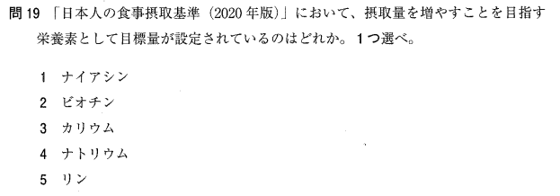 解説: 「日本人の食事摂取基準(2020年版)」において、生活習慣病の予防を目的として「摂取量を増やすことを目指す」目標量が設定されているのはカリウムです 。カリウムはナトリウムの排泄を促し、高血圧の予防に寄与します。逆に、ナトリウムは「摂取量を減らすことを目指す」目標量(食塩相当量として)が設定されています 。