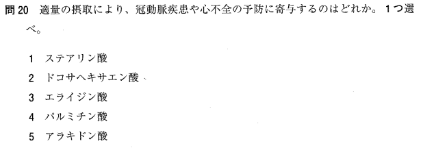 解説: ドコサヘキサエン酸(DHA)は、青魚などに多く含まれるn-3系(オメガ3)の多価不飽和脂肪酸です 。適量の摂取は血中トリグリセリドの低下や血小板凝集抑制作用をもたらし、冠動脈疾患や心不全の予防に寄与します。ステアリン酸 やパルミチン酸 は飽和脂肪酸、エライジン酸 はトランス脂肪酸であり、過剰摂取は心疾患のリスクを高めます。