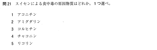 解説: スイセンによる食中毒の原因物質は、アルカロイドの一種であるリコリンなどです 。スイセンの葉をニラと、球根をタマネギと間違えて誤食する事故が頻発しています。