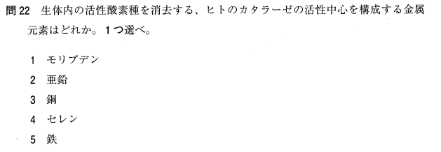 解説: ヒトのカタラーゼは、生体内で発生した過酸化水素(活性酸素種の一つ)を水と酸素に分解する酵素です 。この酵素の活性中心には鉄(ヘム鉄)が存在します 。