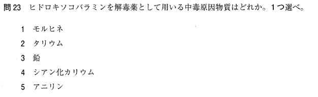 解説: ヒドロキソコバラミン(ビタミンB12の一種)は、シアン化カリウム(青酸カリ)などのシアン化物中毒に対する解毒薬として用いられます 。シアン化物イオンと結合して無毒なシアノコバラミンとなり、尿中へ排泄されます。