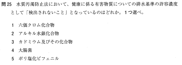 解説: 水質汚濁防止法において、健康項目(人の健康に係る被害を生ずるおそれがある物質)のうち、排水基準が「検出されないこと」と厳しく規定されているのはアルキル水銀化合物です 。