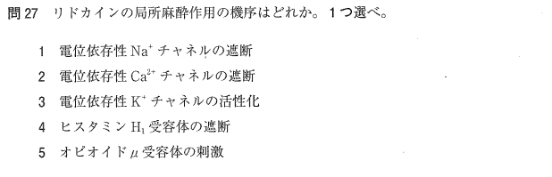 解説: リドカインはアミド型の局所麻酔薬です。神経細胞膜の電位依存性Naチャネルを細胞の内側から遮断することで、Na+の細胞内流入を抑えて活動電位の発生を抑制し、知覚神経の伝導を遮断します 。