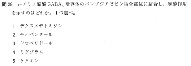 解説: ミダゾラムはベンゾジアゼピン系の静脈麻酔薬です 。GABAA受容体のベンゾジアゼピン結合部位に結合し、GABAによるCl-チャネル開口作用をアロステリックに増強することで中枢抑制(麻酔・鎮静作用)を示します 。