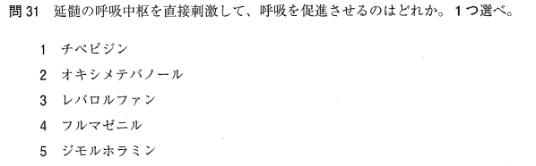 解説: ジモルホラミンは、延髄の呼吸中枢を直接刺激して呼吸を促進する呼吸興奮薬です 。チペピジンやオキシメテパノールは鎮咳薬、レバロルファンはオピオイド受容体拮抗薬、フルマゼニルはベンゾジアゼピン受容体拮抗薬です。