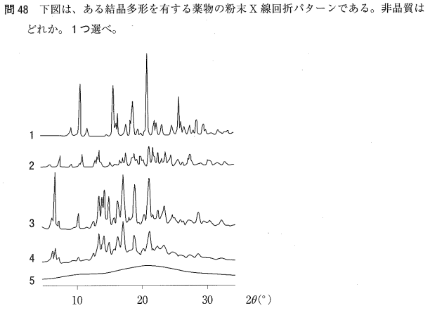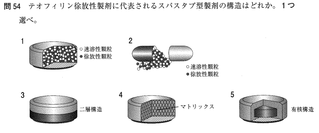 解説: スパスタブ(スパンスル)型製剤とは、溶解速度の異なる複数の顆粒(速溶性顆粒と徐放性顆粒など)を混合して、ひとつの硬カプセルに充填した構造の製剤です。図の中でこの構造を表しているのは1です。