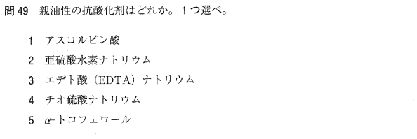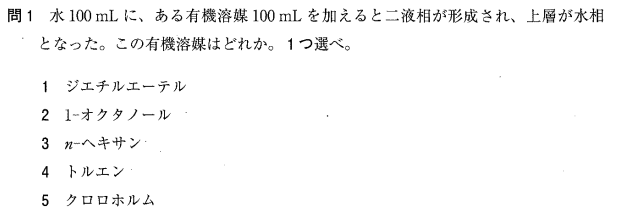 解説: 水(密度約1.0g/cm³)と混和せず二層に分かれる有機溶媒のうち、水層が上層になるということは、その有機溶媒の密度が水よりも大きいことを意味します 。選択肢の中で水より密度が大きいのはクロロホルム(密度約1.49g/cm³)のみです 。