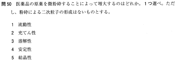 解説: 医薬品の原薬を微粉砕して粒子径を小さくすると、粉体全体の表面積(比表面積)が増大します。Noyes-Whitneyの式にも示される通り、表面積が大きくなると溶媒と接する面積が増えるため、薬物の溶解性(溶解速度)が増大します。