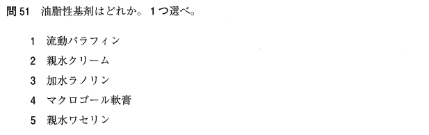 解説: 軟膏剤の基剤分類についての問題です。流動パラフィンは炭化水素類であり、代表的な油脂性基剤の一つです。 (親水クリームはO/W型乳剤性基剤、加水ラノリンはW/O型乳剤性基剤、マクロゴール軟膏は水溶性基剤、親水ワセリンは吸水性軟膏基剤に分類されます)。