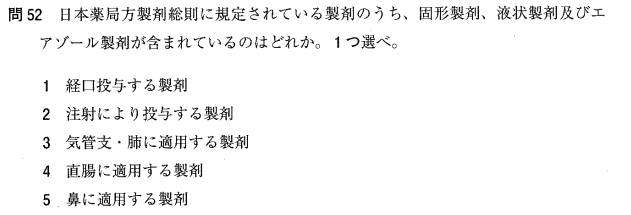 解説: 日本薬局方の製剤総則において、気管支・肺に適用する製剤(吸入剤)には、固形製剤(粉末吸入剤)、液状製剤(吸入液剤)、およびエアゾール製剤(吸入エアゾール剤)のすべてが含まれています。経口投与や注射剤にはエアゾール製剤は含まれません。