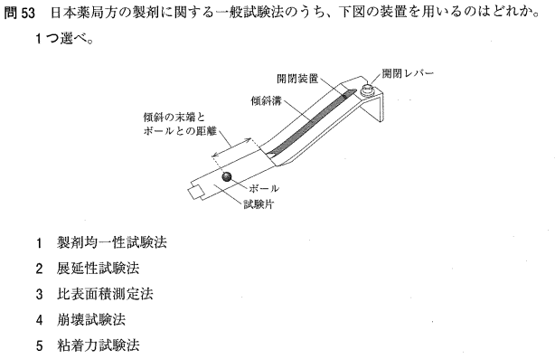 解説: 図の装置は、傾斜させた斜面の上からボールを転がし、試験片(粘着テープや貼付剤など)上でボールが停止するまでの距離等を測定する「傾斜式ボールタック試験装置」です。これは貼付剤などの粘着力試験法に用いられます。