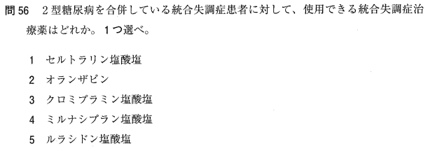 解説: 統合失調症治療薬のうち、オランザピン やクエチアピンは、著しい血糖値の上昇から糖尿病性ケトアシドーシスや糖尿病性昏睡に至るおそれがあるため、糖尿病の患者または糖尿病の既往歴がある患者には禁忌とされています。選択肢の中で統合失調症治療薬であり、かつ糖尿病合併患者に使用できるのはルラシドン塩酸塩 です。なお、セルトラリン塩酸塩 、クロミプラミン塩酸塩 、ミルナシプラン塩酸塩 は抗うつ薬です。