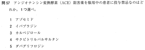 解説: サクビトリルバルサルタン (アンジオテンシン受容体ネプリライシン阻害薬:ARNI)は、ACE阻害薬と併用すると、ブラジキニンの分解が著しく抑制され、重篤な血管浮腫のリスクが増大するため併用禁忌です。ACE阻害薬から切り替える場合は、ACE阻害薬の最終投与から36時間以上あける必要があります。