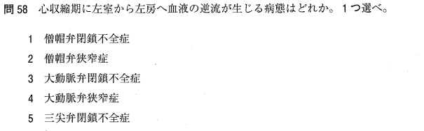 解説: 心室の収縮期には、通常は僧帽弁が閉じて血液が左心房へ逆流するのを防ぎ、大動脈弁が開いて全身へ血液を送り出します。しかし、僧帽弁の閉鎖が不完全だと、収縮期に左心室から左心房へ血液が逆流してしまいます 。この病態を僧帽弁閉鎖不全症と呼びます 。