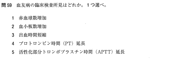 解説: 血友病は、血液凝固第VIII因子(血友病A)または第IX因子(血友病B)の欠乏・異常により出血傾向を示す疾患です 。これらは内因系の凝固因子であるため、内因系の凝固能を評価する活性化部分トロンボプラスチン時間(APTT)が延長します 。外因系のプロトロンビン時間(PT) や、一次止血を反映する出血時間 、血小板数 は通常正常です。