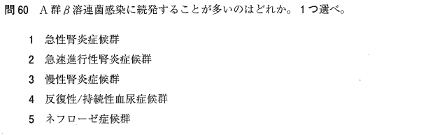 解説: A群溶血性レンサ球菌(溶連菌)による咽頭炎や扁桃炎などに感染してから1〜3週間後に、免疫複合体が糸球体に沈着して急激に発症する腎疾患を、急性糸球体腎炎(急性腎炎症候群)と呼びます 。また、同じく溶連菌感染後に続発する疾患としてリウマチ熱も重要です。