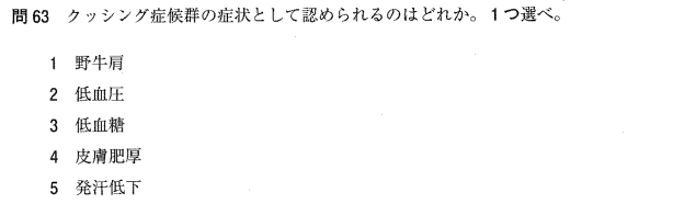解説: クッシング症候群 は、副腎皮質ホルモン(コルチゾール)が過剰に分泌されることで生じます。特徴的な身体症状として、満月様顔貌(ムーンフェイス)、中心性肥満、野牛肩(バッファローハンプ) 、皮膚の菲薄化などが認められます。また、高血糖(低血糖ではない )や高血圧(低血圧ではない )を合併しやすくなります。