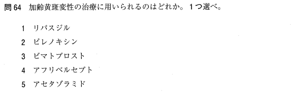 解説: 加齢黄斑変性(滲出型) の原因となる網膜の脈絡膜新生血管の発生・進展には、血管内皮増殖因子(VEGF)が深く関与しています。そのため、抗VEGF薬であるアフリベルセプト やラニビズマブなどを硝子体内に注射する治療が行われます。