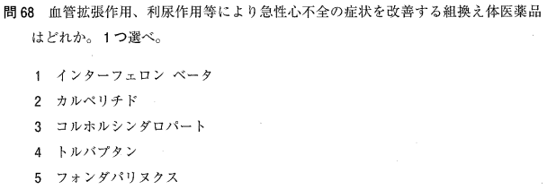 解説: カルペリチド は、遺伝子組換え技術により製造されたヒト脳性ナトリウム利尿ペプチド(hANP)製剤 です。血管平滑筋および腎臓の受容体に結合して細胞内cGMPを増加させ、強力な血管拡張作用と利尿作用を示すことで、急性心不全の血行動態を改善します 。