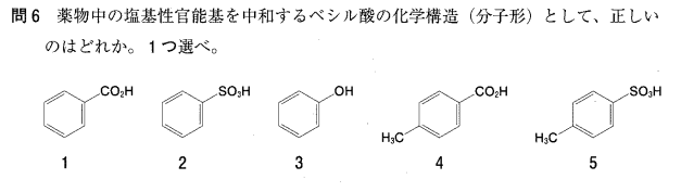 解説: 医薬品の塩基性官能基を中和して塩を形成する際に用いられる「ベシル酸」の化学構造を問う問題です 。ベシル酸の正式な化学名は「ベンゼンスルホン酸(Benzenesulfonic acid)」であり、ベンゼン環にスルホ基(-SO3H)が結合した構造を持ちます 。選択肢の中でこの構造に該当するものが正解となります。