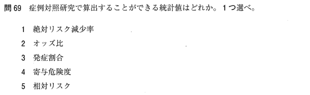 解説: 症例対照研究 は、すでに疾病を発症している「症例群」と、発症していない「対照群」を後ろ向きに比較し、過去の要因への曝露を調べる研究デザインです。集団全体の発生率(罹患率)を直接求めることができないため、相対リスク(リスク比) は計算できません。代わりに、曝露の有無による見込みの比であるオッズ比 を算出して関連の強さを評価します。