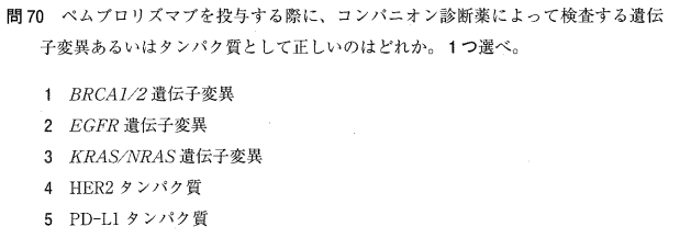 解説: ペムブロリズマブは、T細胞上のPD-1に結合して免疫抑制シグナルを阻害する抗PD-1抗体(免疫チェックポイント阻害薬)です 。この薬の治療効果を予測するため、がん細胞側が発現しているリガンドであるPD-L1タンパク質 の発現率(TPSなど)をコンパニオン診断薬(免疫組織化学染色法など)を用いて事前に検査します 。