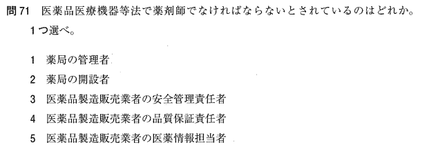 解説: 医薬品医療機器等法(薬機法)第7条第1項において、「薬局の管理者は、薬剤師でなければならない」と定められています 。一方で、薬局の開設者や、医薬品製造販売業者の総括製造販売責任者・品質保証責任者・安全管理責任者などは、要件を満たせば必ずしも薬剤師である必要はありません 。