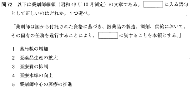 解説: 薬剤師綱領(昭和48年制定)の前文には、「薬剤師は国から付託された資格に基づき、医薬品の製造、調剤、供給において、その固有の任務を遂行することにより、医療水準の向上に資することを本領とする」と明記されています 。