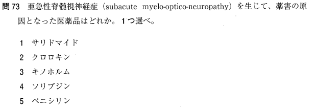 解説: 亜急性脊髄視神経症(SMON:スモン)は、整腸剤として販売されていたキノホルム製剤の服用によって引き起こされた薬害です 。サリドマイドはアザラシ肢症 、ソリブジンは抗がん剤(5-FU系)との致死的な相互作用による骨髄抑制 、ペニシリンはアナフィラキシーショックが大きな薬害・副作用問題となりました 。