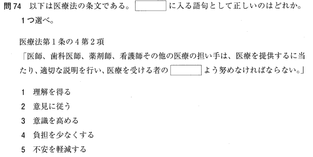 解説: 医療法第1条の4第2項の条文です。これは「インフォームド・コンセント(説明と同意)」の理念を法的に明文化したものであり、「医師、歯科医師、薬剤師、看護師その他の医療の担い手は、医療を提供するに当たり、適切な説明を行い、医療を受ける者の理解を得るよう努めなければならない」と定められています 。