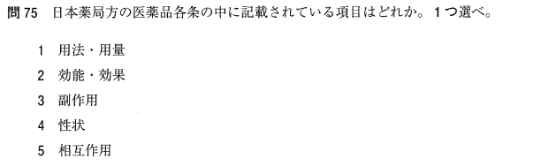 解説: 日本薬局方の「医薬品各条」には、各医薬品の品質の適正を図るため、名称、構造式、分子量、含量規定、性状、確認試験、純度試験、定量法などが記載されています 。用法・用量、効能・効果、副作用、相互作用などは、添付文書(注意事項等情報)の記載項目であり、日本薬局方には記載されません 。