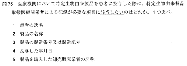 解説: 特定生物由来製品(血液製剤など)は感染症伝播のリスクがあるため、医療機関の管理者は患者への投与記録を20年間保存する義務があります。記録事項は「患者の氏名および住所」「製品の名称」「製造番号または製造記号」「投与した年月日」です 。製品を購入した卸売販売業者の名称は、医療機関側の投与記録には含まれません (卸売業者が譲り渡し記録として保存します)。