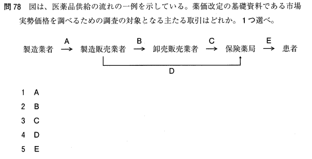 解説: 薬価基準の改定(薬価改定)の基礎資料とするために行われる「薬価調査(市場実勢価格の調査)」は、主として卸売販売業者から保険薬局や医療機関等への販売価格(納入価)を対象として実施されます 。図式において卸売販売業者から保険薬局への流れを示す「C」の取引がこれに該当します 。