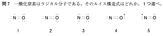 解説: ラジカル分子である一酸化窒素(NO)のルイス構造式を選択する問題です 。窒素(価電子数5)と酸素(価電子数6)からなるNOは、分子全体で合計11個の価電子を持ちます。すべての電子を対(ペア)にすることはできないため、不対電子(ラジカル)が1つ生じます。窒素と酸素が二重結合で結ばれ、電気陰性度の小さい窒素原子上に不対電子が配置された構造が正しいルイス構造式となります 。