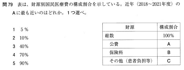 - その他(患者の窓口負担など):約10%(約11〜12%) したがって、公費の割合である「A」に最も近い数値は40%となります 。