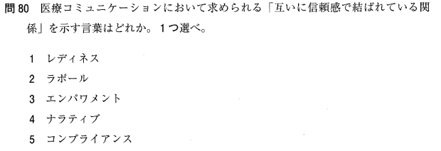 解説: 医療従事者と患者との間に築かれる「互いに信頼感で結ばれている関係(心が通い合っている状態)」を示す心理学・コミュニケーション用語はラポールです 。