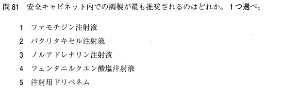 解説: パクリタキセル注射液 などの抗悪性腫瘍薬(抗がん剤)は、細胞毒性や発がん性、催奇形性を持つため、調製者への曝露(吸入や付着)を防ぐ必要があります。そのため、安全キャビネット内での調製が強く推奨されます。