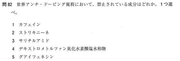 解説: 世界アンチ・ドーピング規程において、ストリキニーネ は興奮薬として「競技会(インコンペティション)検査」において禁止されている物質です。なお、カフェインはかつて禁止物質でしたが、現在は監視プログラムの対象となっており禁止物質からは除外されています。