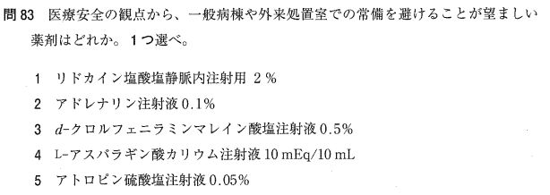 解説: L-アスパラギン酸カリウム注射液10mEq/10 mL などの高濃度カリウム製剤は、急速静注すると致死的な不整脈や心停止を引き起こすハイリスク薬です。誤投与を防ぐため、一般病棟や外来処置室での常備(定数配置)は避け、必要時に都度薬局から払い出すなどの厳重な管理が求められます。