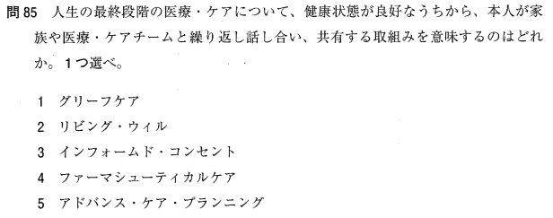 解説: 人生の最終段階における医療やケアについて、患者本人が家族や医療・ケアチームと事前に、かつ繰り返し話し合い、意思を共有するプロセスのことをアドバンス・ケア・プランニング (ACP、愛称:人生会議)と呼びます。