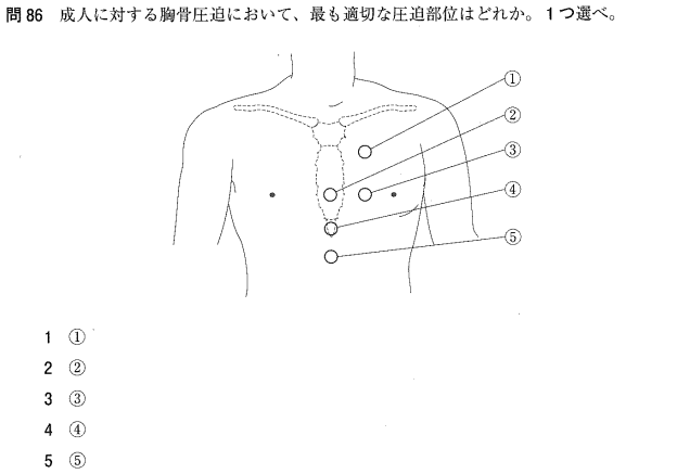 解説: 成人に対する一次救命処置(BLS)における胸骨圧迫では、「胸骨の下半分(②の位置)」 を圧迫するのが最も適切です。剣状突起(④の位置)を圧迫すると内臓損傷の危険があるため避ける必要があります。