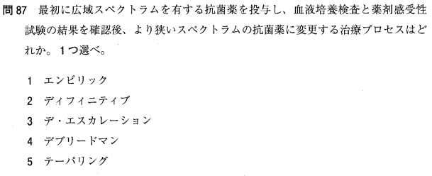 解説: 重症感染症などで原因菌が特定されていない初期段階に、幅広い菌に効く広域抗菌薬(エンピリック治療)を開始し、その後、培養検査や薬剤感受性試験の結果をもとに、より原因菌に的を絞った狭いスペクトラムの抗菌薬へ切り替える(または不要な薬を中止する)ことをデ・エスカレーションと呼びます。耐性菌の出現を防ぐための重要なプロセスです。