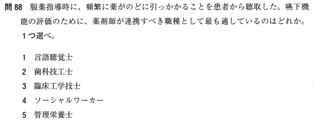 解説: 嚥下機能(飲み込む力)や発声・構音機能の評価、およびリハビリテーションを専門とする医療職種は言語聴覚士 (ST:Speech-Language-Hearing Therapist)です。薬が飲み込みにくい(嚥下困難)患者への対応において、剤形の変更検討などとともに連携すべき重要な職種です。